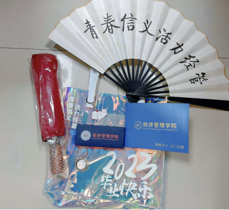 best365网页版登录官方网站特意为 2023 届毕业生设计了“青春信义,活力经管”主题的专属定制手提袋。手提袋里包含一把校庆定制扇,希望毕业生“扇去烦恼”,一枚樱花林钥匙扣,希望毕业生“扣住青春”,一把学院文化伞,希望毕业生“撑起未来”,以及一封教师寄语信,希望毕业生“永怀感恩”。
