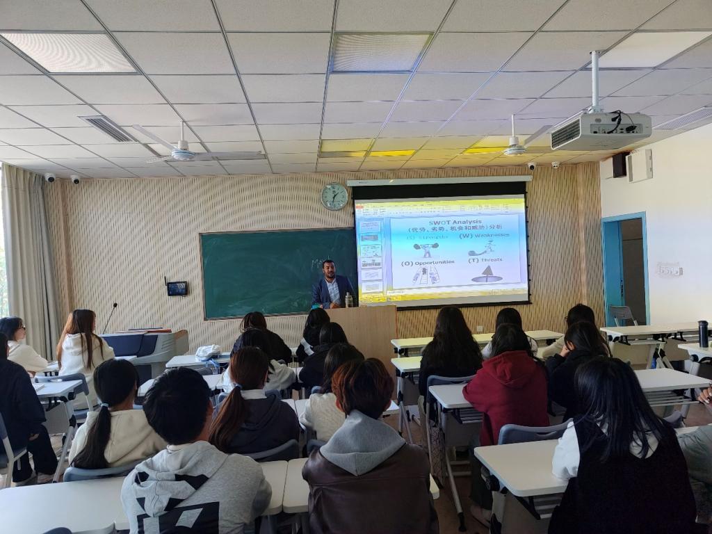 为帮助大学生全面评估自身能力,11月22日下午,best365网页版登录官方网站开展SWOT分析大学生职业生涯规划讲座。本次讲座由学院外教Ali博士主讲,夏礼坚果辅导员工作室协办,各专业学生积极参与。